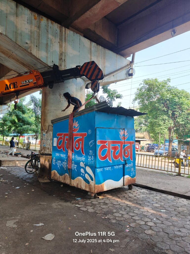 शहर में सुगम आवागमन एवं अतिक्रमण मुक्त करने प्रशासन की टीम जिलाधीश डॉ. सर्वेश्वर नरेन्द्र भुरे के निर्देश पर बाजार क्षेत्र के दुकानों का सामान बाहर रखने पर उसे दुकान के अंदर रखने तथा दुकान के बाहर लगे शेड हटाने समझाईस दिए थे। समझाईस उपरांत गुड़ाखु लाईन, जूनी हटरी से अतिक्रमण हटाने की कार्यवाही की गई और आज फ्लाई ओव्हर के नीचे पुराना बस स्टैण्ड चौक से भगत सिंह चौक तक दुकान तथा ठेला खोमचा हटाया गया। उक्त स्थल से अतिक्रमण हटाने पूर्व में भी समझाईस उपरांत कार्यवाही की गई थी। किन्तु पुनः अतिक्रमण होने पर आज निगम प्रशासन तथा यातायात की टीम अतिक्रमण हटाने की कार्यवाही की। कुछ दुकानदारों के द्वारा निगम की बिना अनुमति के 8 विद्युत मीटर लगाया गया था, जिसे जप्त किया गया है। साथ ही फ्लाई ओव्हर में बेतरतीब खड़े वाहन को भी यातायात की टीम ने हटाने की कार्यवाही की। इसी प्रकार फ्लाई ओव्हर के नीचे निवासरत् परिवारों को पुराना रेस्ट हाऊस रोड स्थित रैन बसेरा में रहने समझाईस दी गई। रैन बसेरा में रहने के लिए सभी आवश्यक व्यवस्था दुरूस्त कर ली गई है।