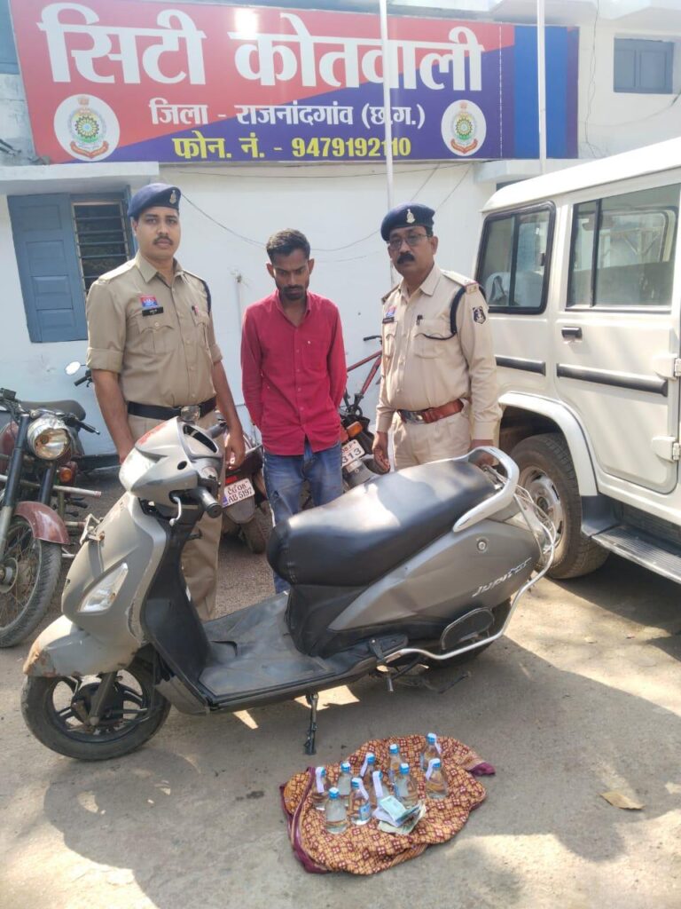 पुलिस अधीक्षक सुश्री अंकिता शर्मा के निर्देश एवं अतिरिक्त पुलिस अधीक्षक राहुल देव शर्मा तथा नगर पुलिस अधीक्षक पुष्पेन्द्र नायक राजनादगांव के मार्गदर्शन एवं थाना प्रभारी निरीक्षक नंदकिशोर गौतम के नेतृृत्व मे थाना कोतवाली पुलिस द्वारा असामाजिक तत्वों एवं अवैध शराब बिक्री करने वालो के विरूद्व चलाए जा रहे अभियान के तहत 14.112025 को मुखबीर की सूचना पर घेराबंदी कर घटना स्थल बायपास मुरूम खदान के पास लखोली में आरोपी देवेन्द्र साहू पिता अलख राम साहू उम्र 28 वर्ष साकिन दुर्गा चौक लखोली थाना सिटी कोतवाली जिला राजनांदगाव (छ0ग0) को अवैध रूप से शराब बिक्री करते रंगे हाथ पकड़ा गया, जिसके कब्जे से 10 पौवा देशी प्लेन मदिरा मात्रा 1.800 बल्क लीटर कीमती 800 रूपये, बिक्री रकम 850 रूपये एवं जुपीटर स्कुटी क्रमंाक सी0जी0 08 ए0पी0-4598 किमती 50,000 रूपये जप्त कर आरोपी के खिलॉफ आबकारी अधिनियम के तहत प्रर्याप्त अपराध सबूत पाये जाने से गिरफ्तार कर अप0क्र0 693/25 धारा 34 (1) आबकारी एक्ट पंजीबद्व किया गया। आगे भी अवैध रूप से शराब बिक्री में संलिप्त लोगों के खिलाफ लगातार कार्यवाही जारी रहेगी।