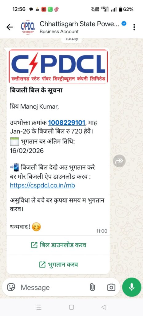 रायपुर, 6 फरवरी 2026। प्रदेश के बिजली उपभोक्ताओं को अब उनके व्हाट्स एप नंबर पर बिल भेजा जाएगा। वे इस बिल का पीडीएफ डाउनलोड करके सुरक्षित रख सकेंगे, उसका प्रिंट भी निकाल सकेंगे। इसमें उन्हें एक क्लिक करके बिल भुगतान की सुविधा भी मिलेगी। यह व्हाट्स एप मैसेज छत्तीसगढ़ स्टेट पॉवर डिस्ट्रीब्यूशन कंपनी लिमिटेड के आफिसियल वेरीफाइड आईडी से भेजी जाएगी, जिसमें अधिकृत ब्लूटिक लगी रहेगी।