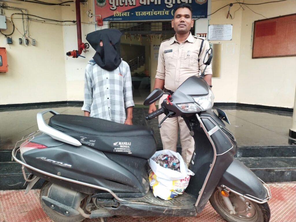 राजनांदगांव 31 अक्टूबर। अवैध शराब तस्करी करने वाले एक आरोपी को पुलिस ने गिरफ्तार किया है। आरोपी के कब्जे से 36 पौवा शराब  मात्रा 6.480 बल्क लीटर कीमती  3,600 रुपया एवं घटना मे प्रयुक्त होंडा एक्टिवा क्रमांक  CG 08 BC 6563  कीमती 80,000 रुपया जुमला कीमती 83,600/- रुपया जप्त।