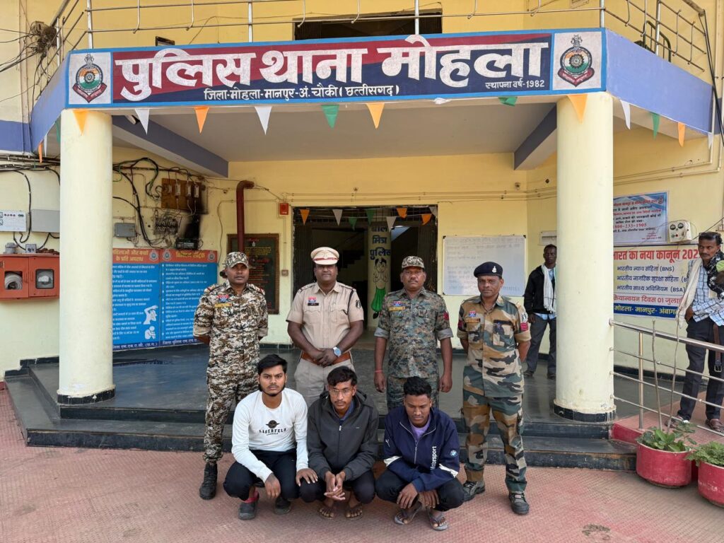 थाना प्रभारी निरीक्षक कपिल देव चन्द्रा के कुशल नेतृत्व में मामले की गंभीरता को देखते हुए तत्काल थाना स्तर पर टीम गठित कर तीनों आरोपी 1. युवराज देवहारे पिता रमेश देवहारे जाति हल्बा उम्र 23 साल निवासी ग्राम साल्हे थाना डोंगरगांव जिला राजनांदगांव 2. अभिषेक नाथ योगी पिता देवपाल नाथ योगी जाति योगी उम्र 23 साल निवासी ग्राम गेंदाटोला थाना मोहला जिला राजनांदगांव 3. मोनेश अहिरवार पिता दयालू राम अहिरवार उम्र 22 साल निवासी ग्राम मुढ़िया मोहारा चौकी मोहारा जिला राजनांदगांव से पूछताछ किया गया जिन्होने जुर्म स्वीकार करने पर दिनांक 11.11.2025 को ज्यूडिशियल रिमाण्ड पर भेजा गया है।
