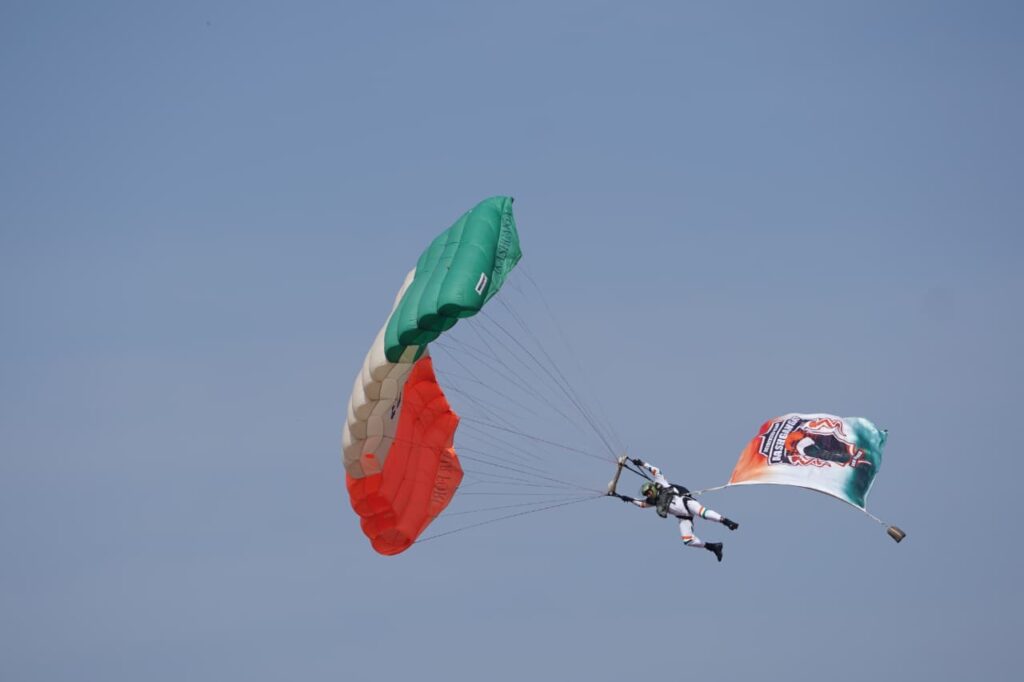 वायु सेना के जाबांज फाइटर पायलटों ने आसमान में दिल की आकृति बनाकर 25वें राज्योत्सव की शुभकामनाएं दीं। उन्होंने तिरंगे के तीन रंगों से डीएनए की आकृति बनाकर तिरंगे के प्रति अपना सम्मान प्रस्तुत किया। उन्होंने 360° में फाइटर जेट उड़ाते हुए उल्टा जेट भी उड़ाया। तेजस और युवाओं को समर्पित अंग्रेजी अक्षर ‘वाई’ की आकृति बनाने के साथ ही कई करतब दिखाए। टीम का प्रदर्शन केवल मनोरंजन नहीं, बल्कि युवाओं में देशप्रेम, साहस और भारतीय सशस्त्र बलों में सेवा की प्रेरणा जगाने का संदेश भी देता है।