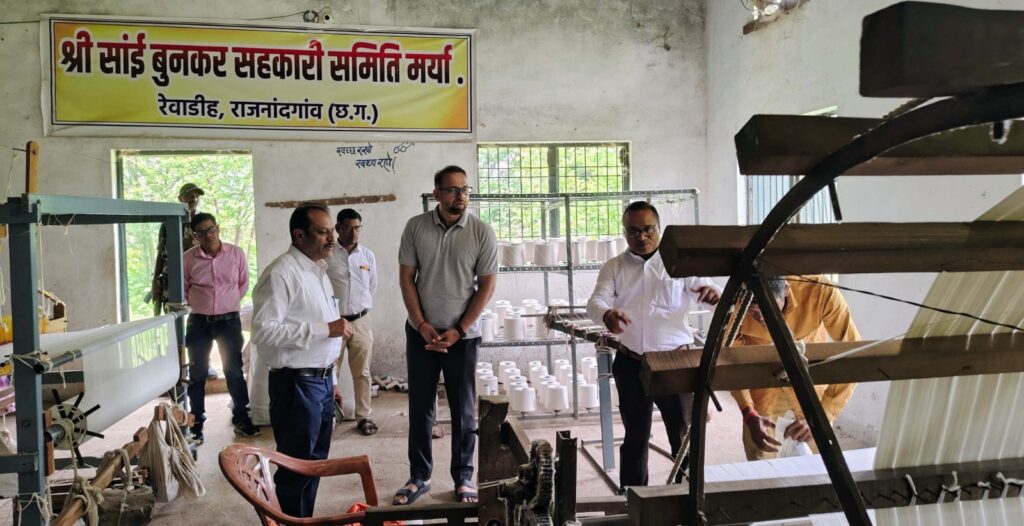 राजनांदगांव 04 अगस्त 2025। कलेक्टर डॉ. सर्वेश्वर नरेन्द्र भुरे ने राजनांदगांव विकासखंड के ग्राम रेवाडीह में संचालित श्री सांई बुनकर सहकारी समिति मर्यादित का आकस्मिक निरीक्षण किया। कलेक्टर ने बुनकर कर्मशाला भवन में समिति के बुनकरों द्वारा किये जा रहे गणवेश वस्त्र एवं अन्य वस्त्र उत्पादों का अवलोकन किया। उन्होंने बुनकरों से बुनाई संबंधी गतिविधियों का जायजा लिया। कलेक्टर ने बुनकरों से चर्चा कर प्रतिदिन किए जाने वाले उत्पादन तथा मासिक आय सहित अन्य विषयों के संबंध में चर्चा की।