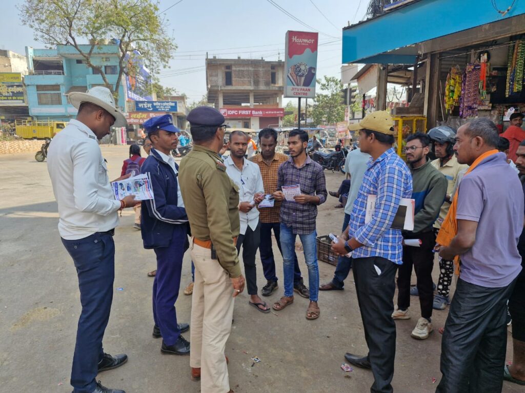 राजनांदगांव 15 जनवरी। सड़क सुरक्षा माह के दौरान 15.01.2026 को सुश्री अंकिता शर्मा पुलिस अधीक्षक राजनांदगांव के निर्देशन में एवं पुष्पेन्द्र नायक अतिरिक्त पुलिस अधीक्षक राजनांदगांव के मार्गदर्शन में यातायात प्रभारी नवरतन कश्यप के नेतृत्व में यातायात पुलिस द्वारा ग्रामीण क्षेत्रों में सिंघोला, कमरतरा, सुखरी, जंगलपुर एवं शहर के नंदई चौक में यातायात नियमों का प्रचार-प्रसार करते हुए दुपहिया वाहन में बिना हेलमेट एवं तीन सवारी, चारपहिया वाहन में बिना सीट बेल्ट, शराब सेवन कर वाहन न चलाने एवं यातायात नियमों के उल्लंघन पर होने वाली कानूनी कार्यवाही एवं सड़क दुर्घटनाओं से होने वाली जन-धन की हानि के संबंध में विस्तारपूर्वक जानकारी दी गई। जागरूकता कार्यक्रम में सउनि येनलाल चन्द्राकर एवं कुंजलाल साहू, शरद मसीह का विशेष येगदान रहा। उक्त कार्यक्रम में लगभग 1000 लोग लाभान्वित हुए।